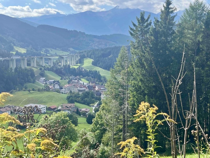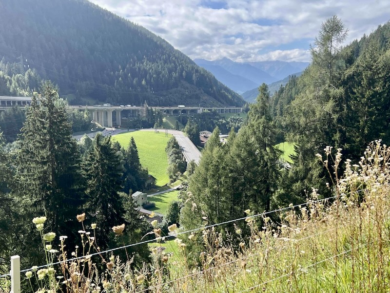 We hebben wat hoogtemeters afgelegd en kijken richting het zuiden en zien aan de andere kant van het dal de Brennerautobahn, A22, liggen.