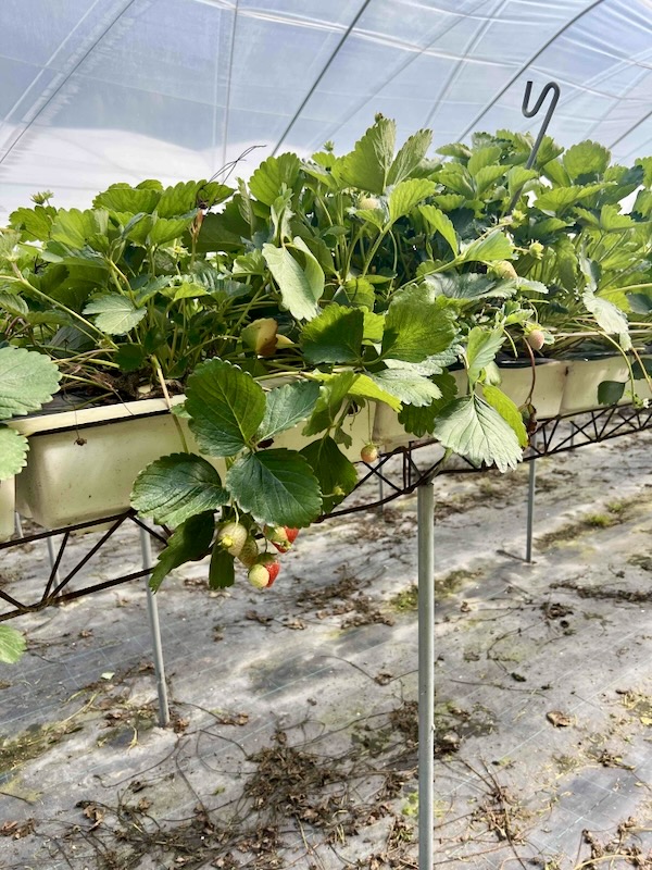 Het blijkt om aardbeien te gaan. Bijzonder, het is tenslotte al september. Later vernemen we op het internet dat aardbeien in kassen of onder tunnels geteeld worden met stellingen en goten erin om het seizoen te verlengen. En voor jullie geruststelling: we hebben er geen gepakt.