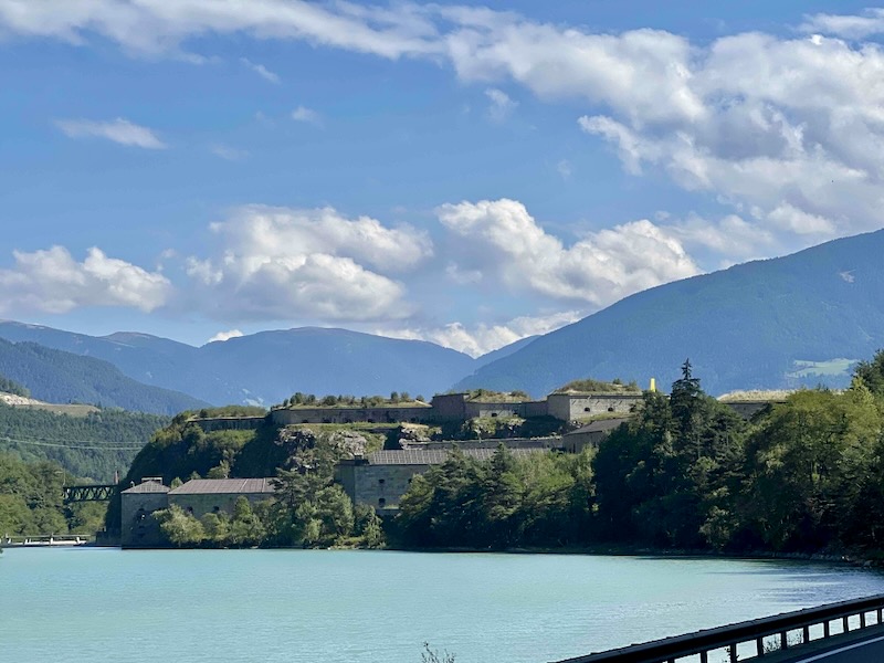 Aan de rand van Fortezza (Franzensfeste) loopt het fietspad onder de Brenner-snelweg door en langs het stuwmeer. In diverse YouTube-films hebben we dit gedeelte van het fietspad gezien en dachten we dat het erg smal was. Het is smal, maar 2 fietsers kunnen elkaar passeren. We krijgen een blik op het fort waar we van de week nog een bezoek brachten. (verslag)