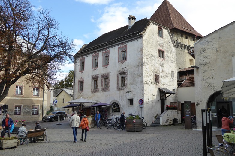 Op het plein zien we vele fietsers, niet zo gek als je bedenkt dat de stad aan de via Claudia Augusta route ligt. De oude Romeinse Alpenoversteek van Augsburg naar Verona via het Inntal. Voor een aantal moeilijke passen zoals bijv. de Fernpas en de Reschenpas zijn pendelbussen beschikbaar.