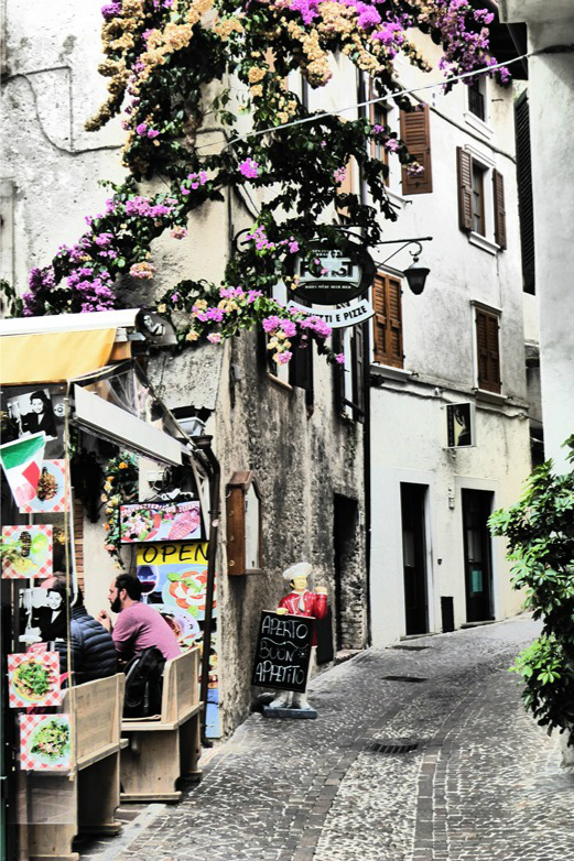 In de zijstraten van het centrum is het rustig. Rondom de haven schuifelen we voetje voor voetje vooruit. Dit wordt veroorzaakt door de boten welke een lijndienst uitvoeren tussen de plaatsen aan het Gardameer en hun passagiers afzetten.