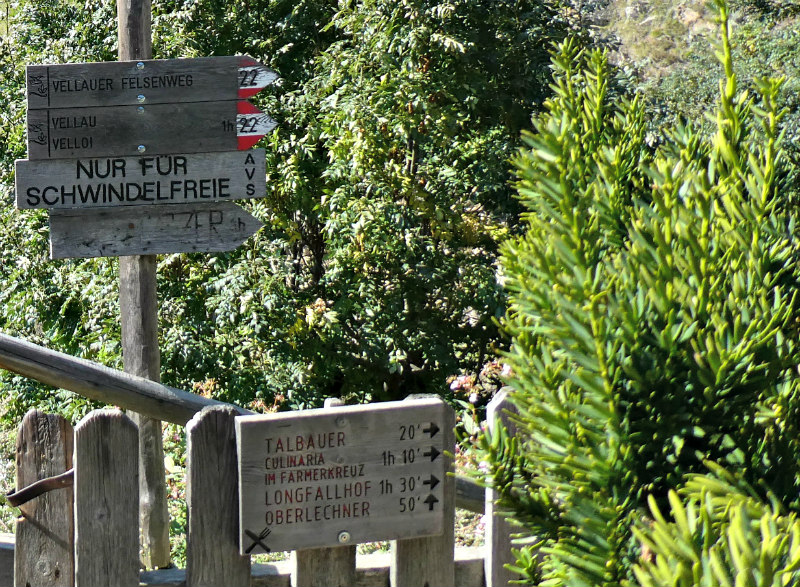 Na de lunch gaan we verder over de Vellauer Felsenweg. Bij het begin van het pad staat een waarschuwing. Alleen voor “schwindelfreie”. Dit houdt in dat de weg alleen geschikt is voor mensen die geen hoogte of diepte vrees hebben en daarnaast gewend zijn om over smalle bergpaden met aan een zijde een diepe afgrond te lopen.