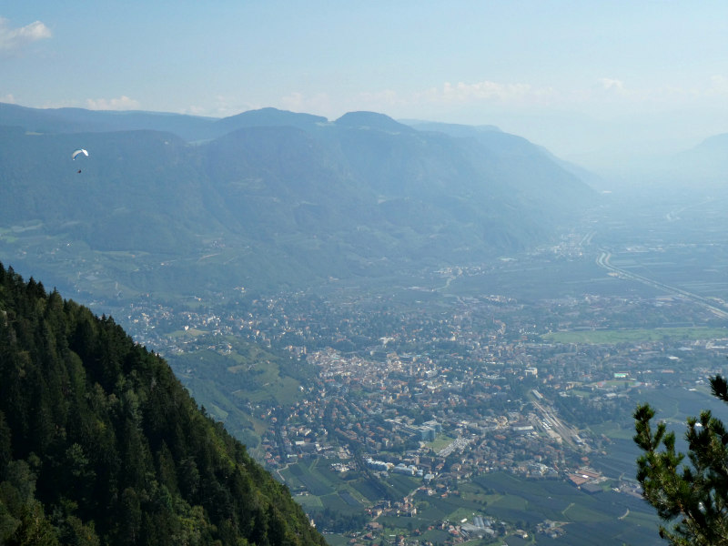 We bereiken het dorpje Vellau waar we in de stoeltjeslift naar Algund kunnen stappen. Natuurlijk is het ook mogelijk om het laatste stuk te voet te gaan, maar het pad is erg steil en je moet in korte tijd vele meters dalen. Voor ons een reden om hiervan af te zien en in de stoeltjeslift nog even na te genieten van de mooie uitzichten.