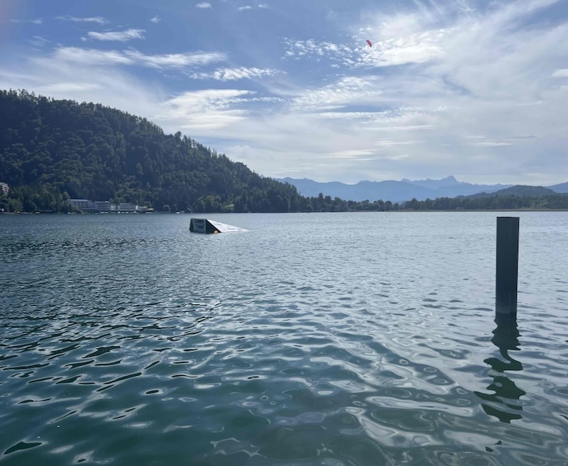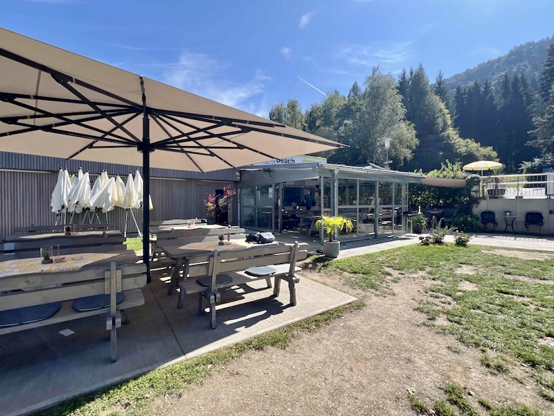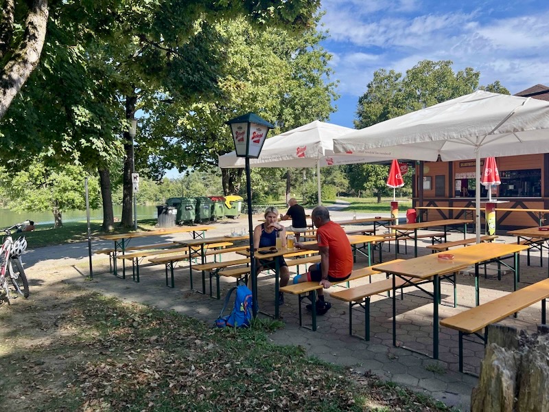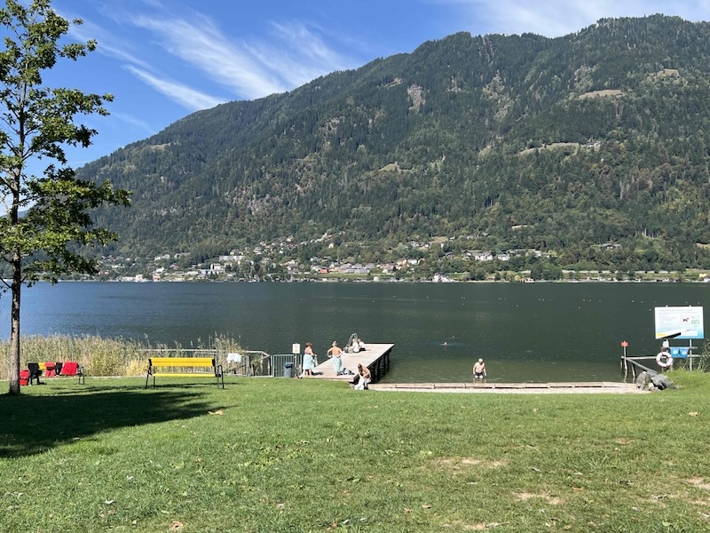 Het wordt tijd voor onze eerste cappuccinostop. Bij bikebeach Villach in (Strandbad St. Andrä) pauzeren we. We hebben inmiddels bijna 1/3 van de tour van vandaag volbracht. De teller staat op 23,6 kilometer. Het strandbad is druk bezocht. Het is één van de weinige plekken rond het meer die openbaar en gratis toegankelijk is.
