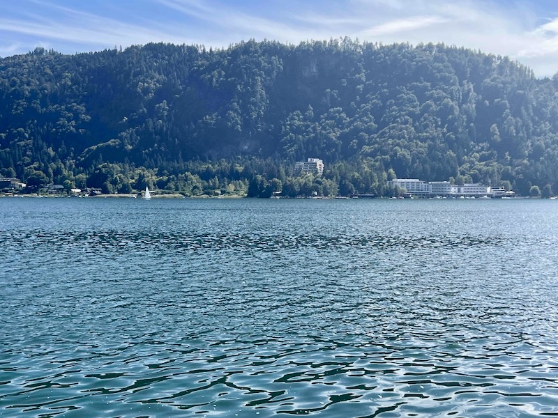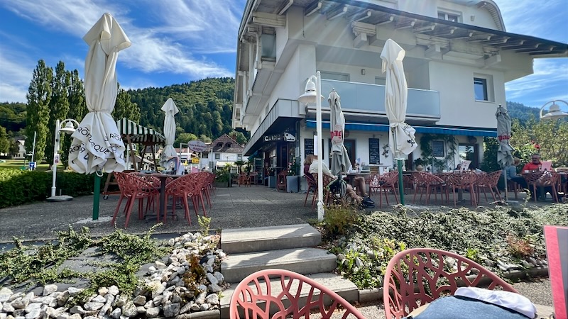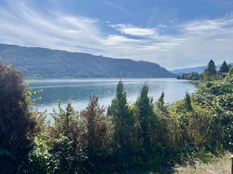 In Alt Ossiach stoppen we voor de tweede keer. Vanaf het terras van de konditorei heb je zicht op het meer. In een ver verleden hebben we hier al eens eerder een consumptie genoten. Toen was het een ijscoupe, nu een cappuccino.