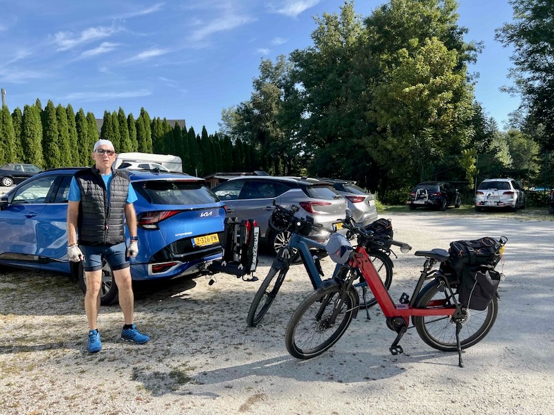 Vandaag starten we direct bij ons hotel. Voordat we kunnen starten, rijden we even langs de parkeerplaats. In de auto liggen nog de helmen en de fietstassen. Die hebben we daar achtergelaten na de tocht van gisteren.
