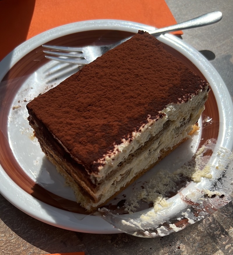 De cappuccino is hier beter dan bij de eerste stop, waar het uit een automaat kwam. We verwennen onszelf en genieten van een stuk tiramisutaart. De binnenzijde van de konditorei is een beetje vergane glorie en heeft een opfrisser nodig.