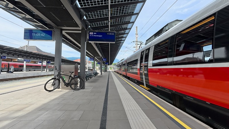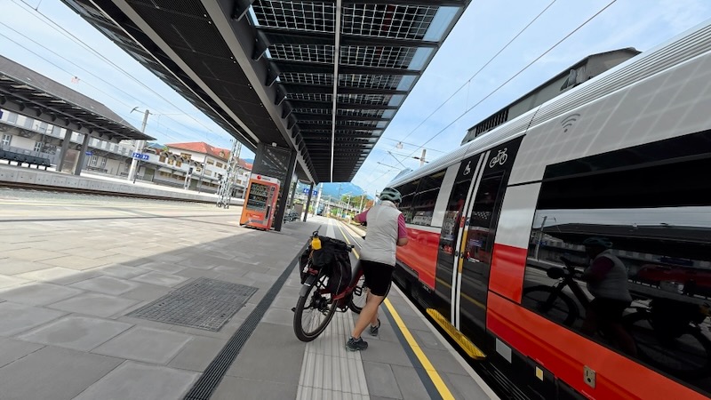 Op het station aangekomen moeten we eerst op zoek naar een kaartjesautomaat. Van het hotel hebben we wel gratis openbaar vervoer in Karinthië maar voor de fiets moeten we nog een ticket aanschaffen. We vinden een kaartjesautomaat maar ondanks dat we de Duitse taal beheersen komt Peter er niet uit. Een medewerker van de Oostenrijkse spoorwegen is zeer behulpzaam en loopt mee naar de automaat om het uit te leggen. Het blijkt heel ingewikkeld te zijn, je moet namelijk eerst je bestemming kiezen en daarna kan je pas een “Fahradkarte” kiezen. We waren gelukkig op tijd vertrokken zodat we ruimschoots de tijd hebben om naar het perron te gaan waar onze trein vertrekt.