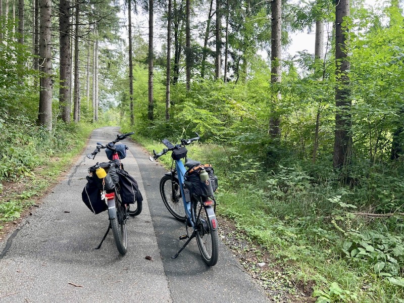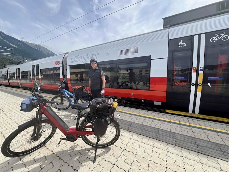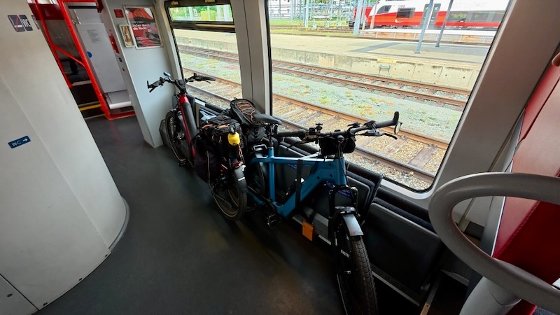 Eenmaal op het perron is het een fluitje van een cent. De Oostenrijkse treinen, City jets, die op de S-bahn rijden hebben een gelijkvloerse instap en speciale plekken waar je de fiets kan stallen en vastzetten. Dat dit in Italië anders is en veel lastiger kan je lezen in het verslag van de Eisacktal radweg later deze vakantie. Het terug reizen met de trein samen met je e-bike of fiets is dan een hele onderneming.