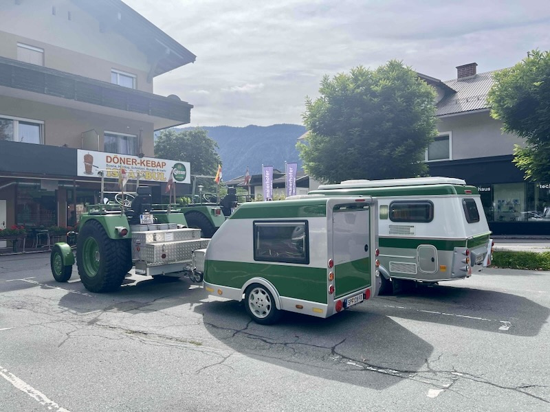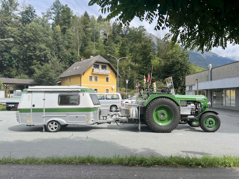 Wij fietsen het centrum van Hermagor in om te kijken of de konditorei open is. Onderweg hadden we vanuit de trein al twee bijzondere combinaties van een traktor met caravan gezien. Deze staan in Hermagor te pauzeren zodat we deze kunnen bewonderen.
