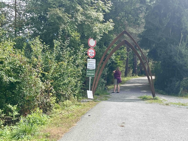 Om direct langs het meer te komen moet er een zijweg ingeslagen worden waar fietsen verboden is. Wij nemen genoegen met een blik op het meer wanneer we bij de ingang van het strandbad van de voormalige Schluga Seecamping staan.
