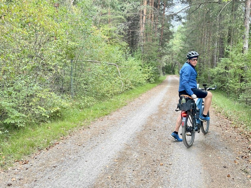 Het is vandaag niet zulk mooi weer als de afgelopen dagen. Het is bewolk en er staat een behoorlijke wind. We doen dan ook over onze bodywarmer een dun fietsjack aan.