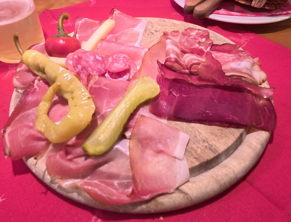 Ook dit keer worden we niet teleurgesteld. Op de brettl liggen diverse soorten schinkenspeck, salami en bergkaas, een aanrader. Het schinkenspeck is niet alleen van varken, maar ook van hert en wild zwijn. Voor thuis nemen we een vacuümverpakking mee met diverse soorten schinkenspek, zoals deze ook op ons bord lag, en natuurlijk een stukje bergkaas en schüttelbrod. Schüttelbrood is een hard, knapperig flatbread dat is ontstaan in Zuid-Tirol.
