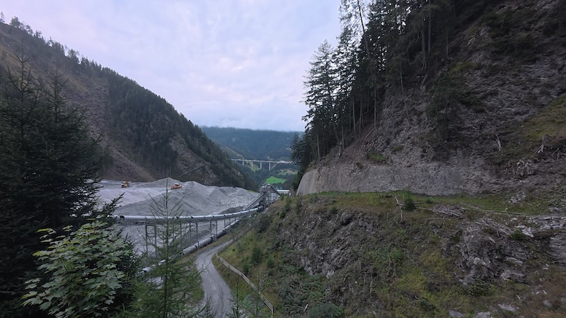 Het materiaal dat uit het gebergte komt, wordt via een geavanceerd transportsysteem met lopende banden vanuit de tunnel naar de stortplaats gebracht.
